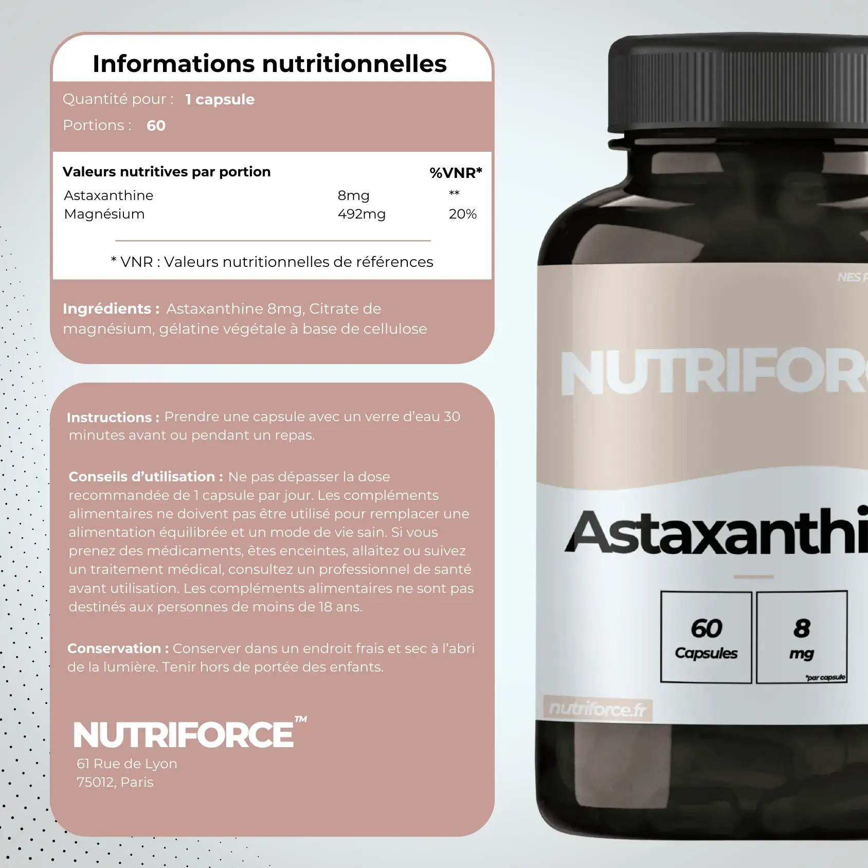 L’astaxanthine protège les cellules du corps contre les radicaux libres. Elle ralentit le vieillissement et le diminue risque de maladies.