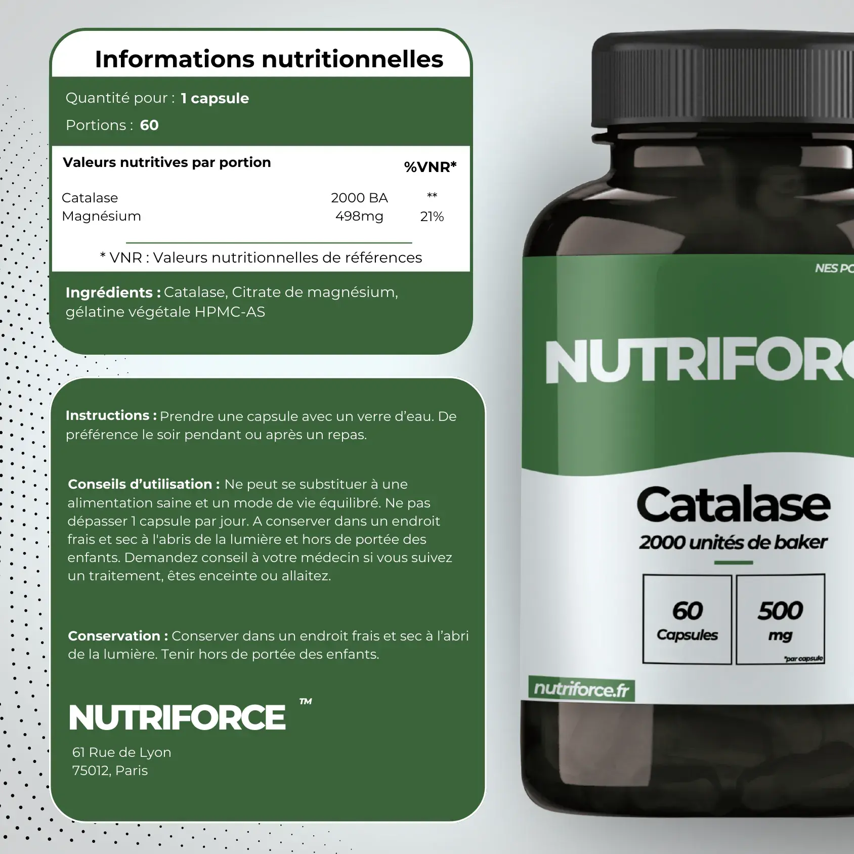 Catalase pure 500mg, gélatine végétale (capsule à base de cellulose)