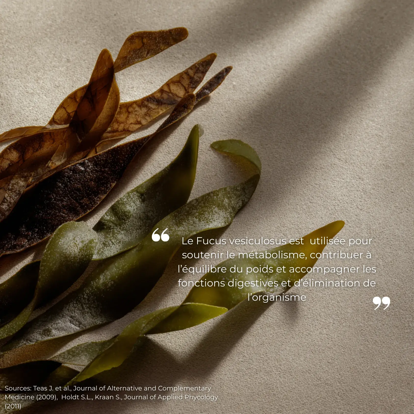 Grâce à sa richesse en fibres solubles et en mucilages, le Fucus se transforme en gel au contact de l’eau dans l’estomac. Ce processus augmente la sensation de satiété et aide à réduire les grignotages, ce qui en fait un allié minceur efficace et naturel.