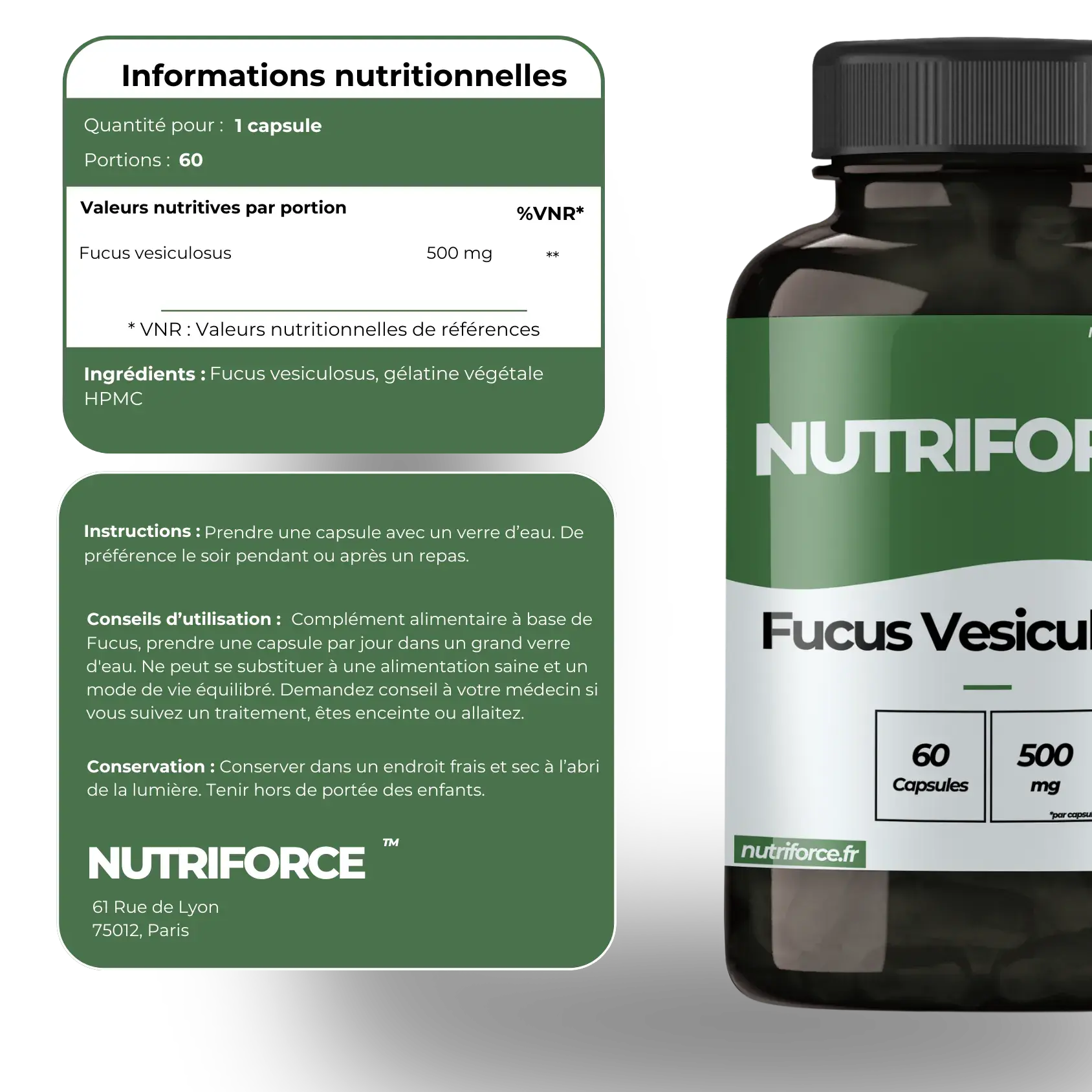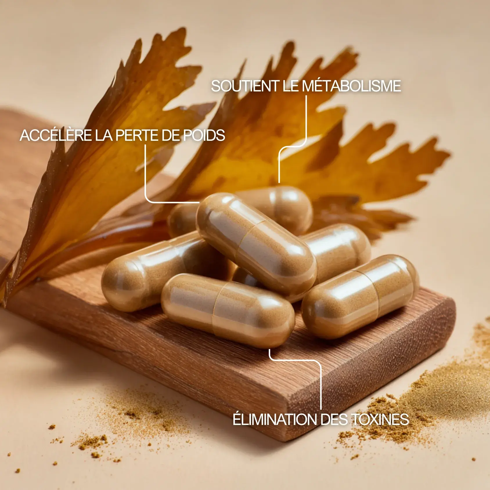 En stimulant le métabolisme via son action sur la thyroïde et en réduisant les apports caloriques grâce à son effet coupe-faim, le Fucus devient un véritable accélérateur minceur. Associé à une alimentation équilibrée, il soutient efficacement les objectifs de perte de poids.