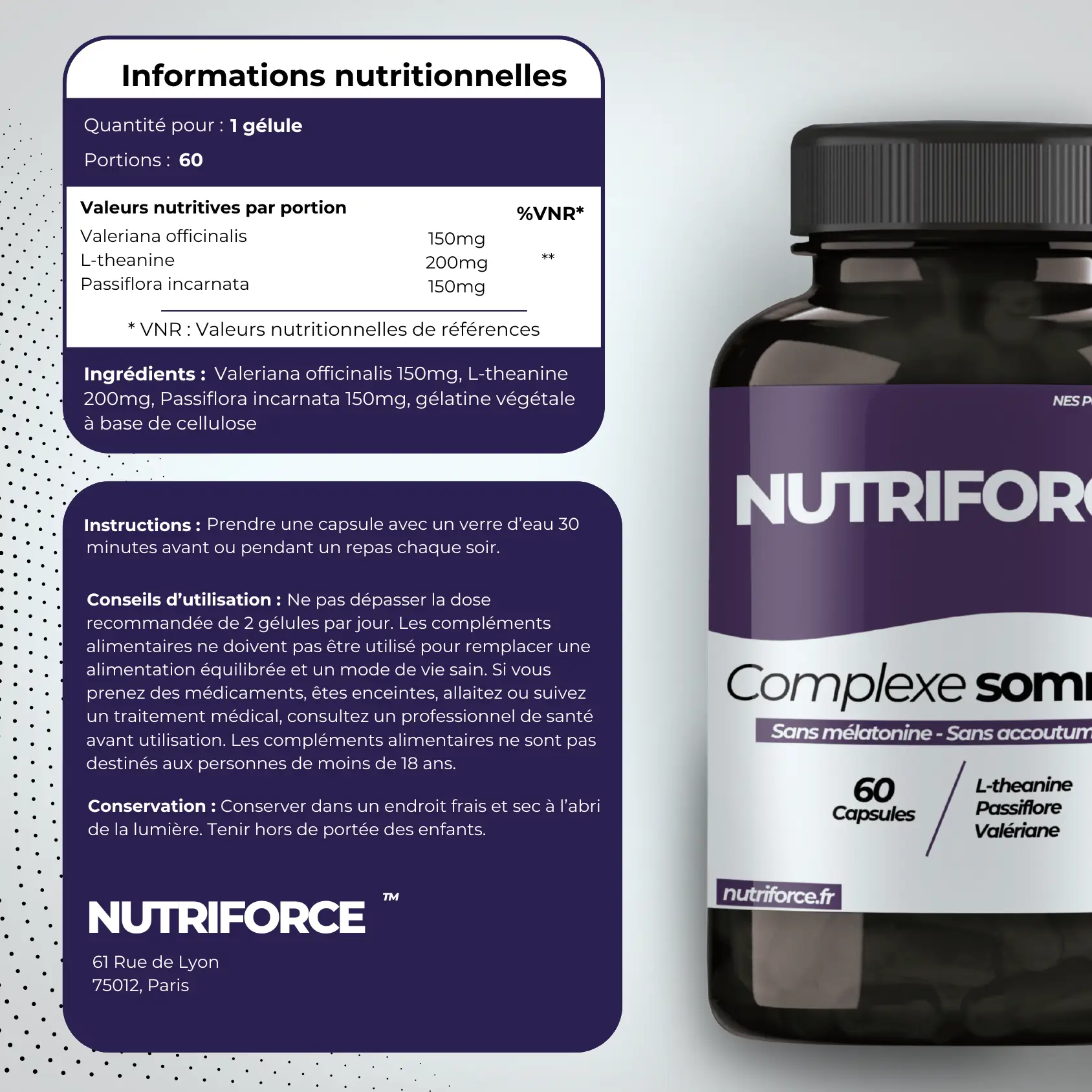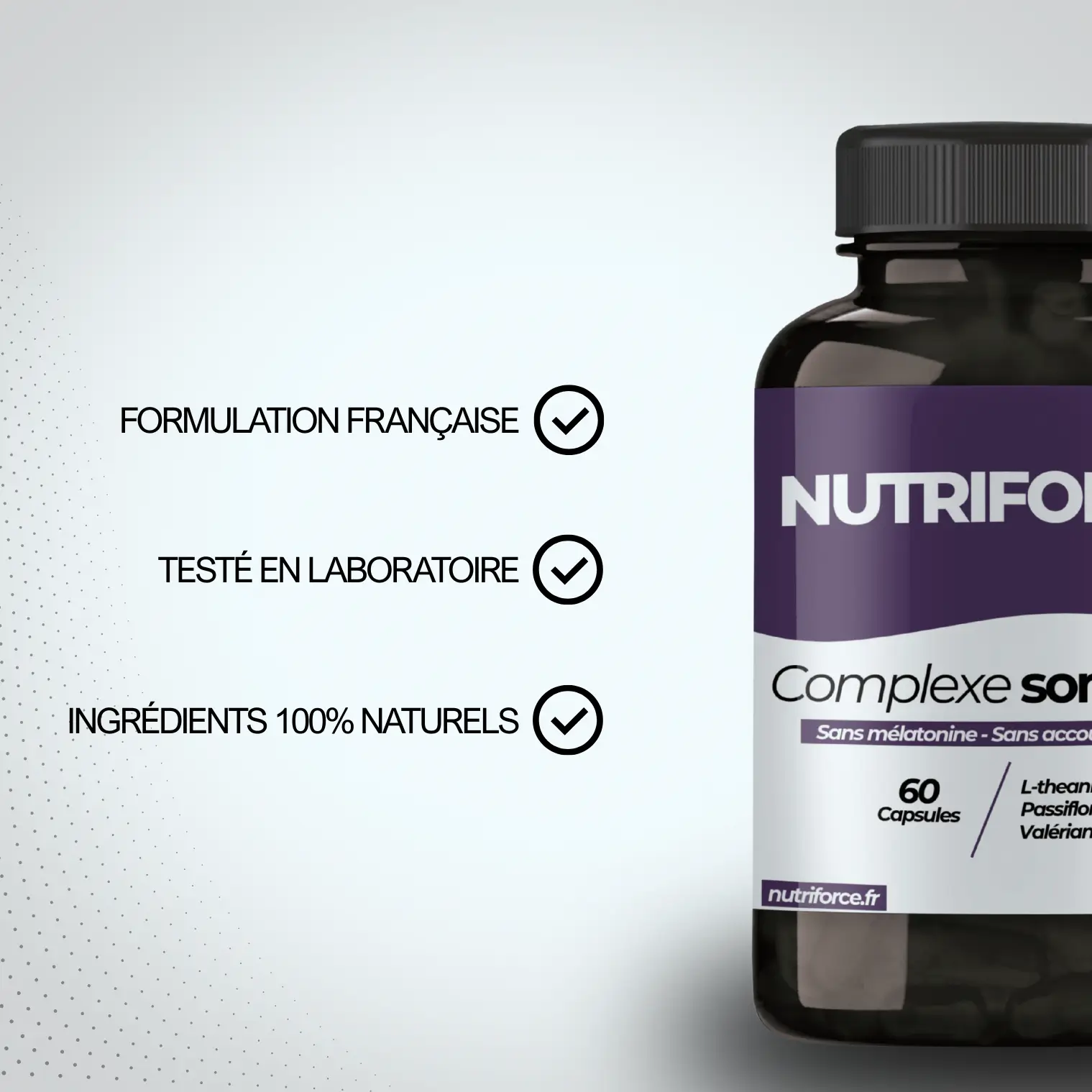 Le complexe Sommeil Nutriforce accompagne les personnes qui souhaitent un sommeil plus réparateur, sans recourir à la mélatonine. Une formule minimaliste, efficace et pensée pour durer.