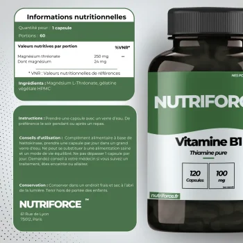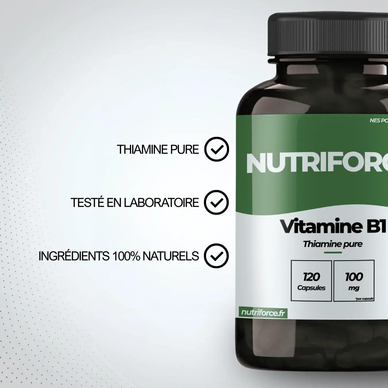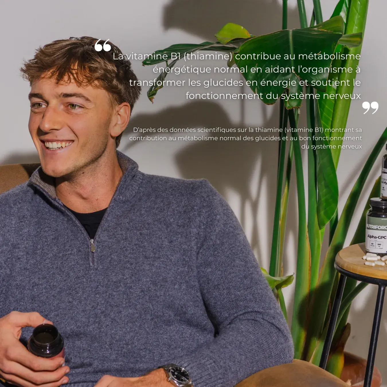 La vitamine B1 joue un rôle essentiel dans le métabolisme des glucides. Elle participe à la transformation des sucres en énergie directement utilisable par l’organisme, contribuant ainsi au bon fonctionnement énergétique et à la réduction de la fatigue.