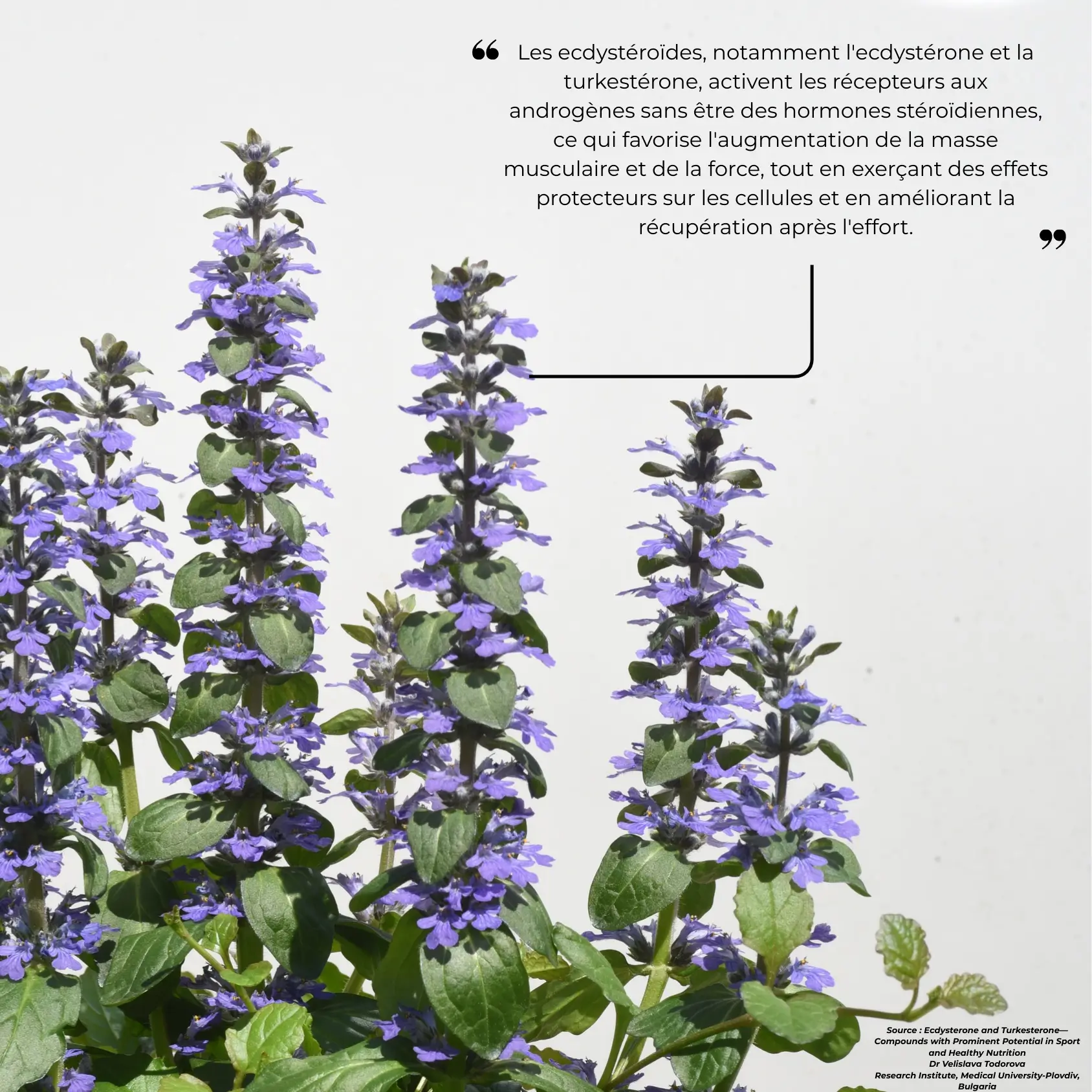 Les substances actives et la Turkesterone sont concentrées dans les feuilles et tiges de la plante. C’est pour cette raison que notre poudre et nos capsules sont constituées uniquement de ces parties de l’Ajuga turkestanica.